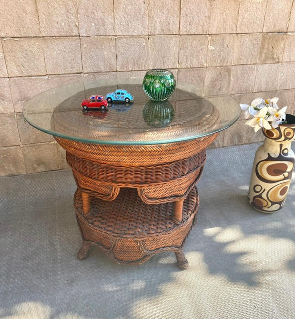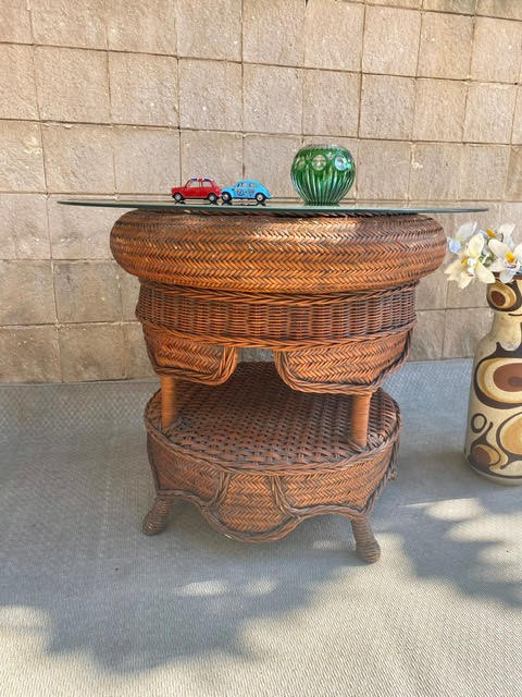 שולחן עשוי קש מסיבי איכותי עם פלטה זכוכית מלמעלה ניתן להורדה הכל במצב מושלם