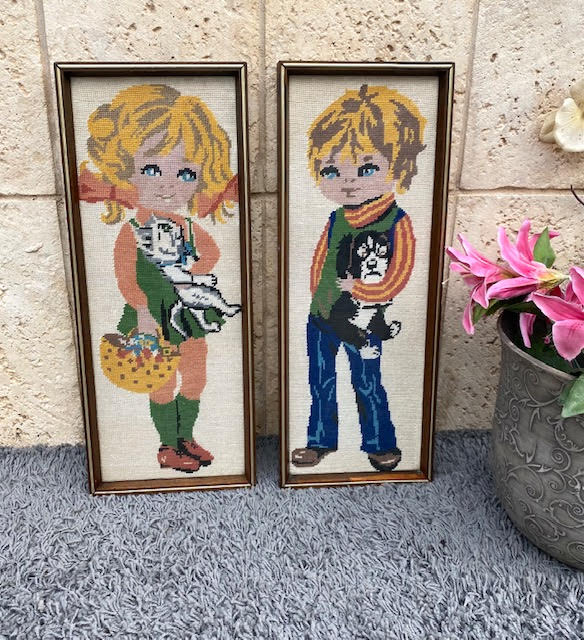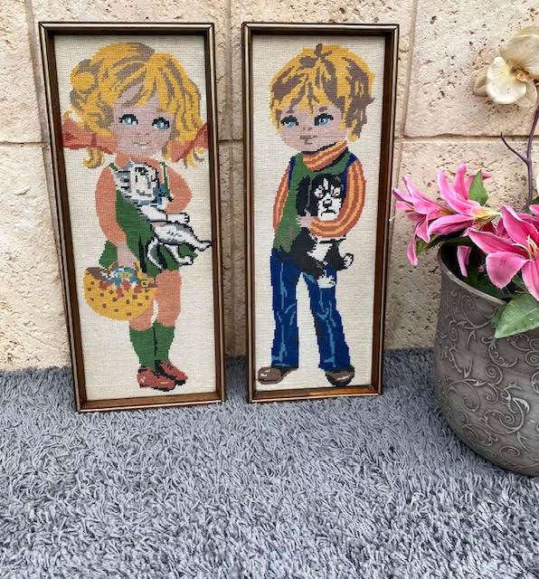 זוג גובלנים עבודת-יד בדמויוצ של ילדים וינטאג' מקורי מלא באופי ויופי ניתן לתלייה על קיר